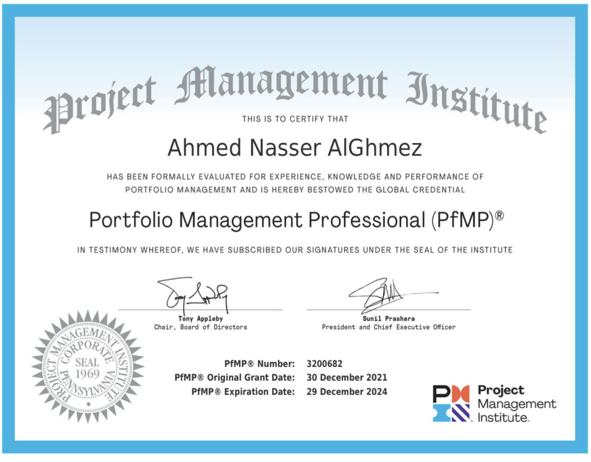 Congratulations Mr. Ahmed AlGhoumiz on Achieving PfMP With Outstanding Score.