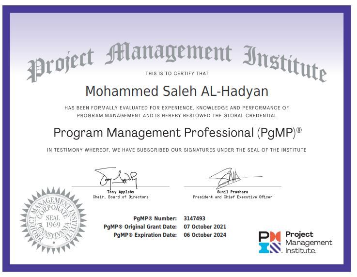 Congratulations Mr. Mohammed Al Hadyan on Achieving PgMP With Outstanding Score