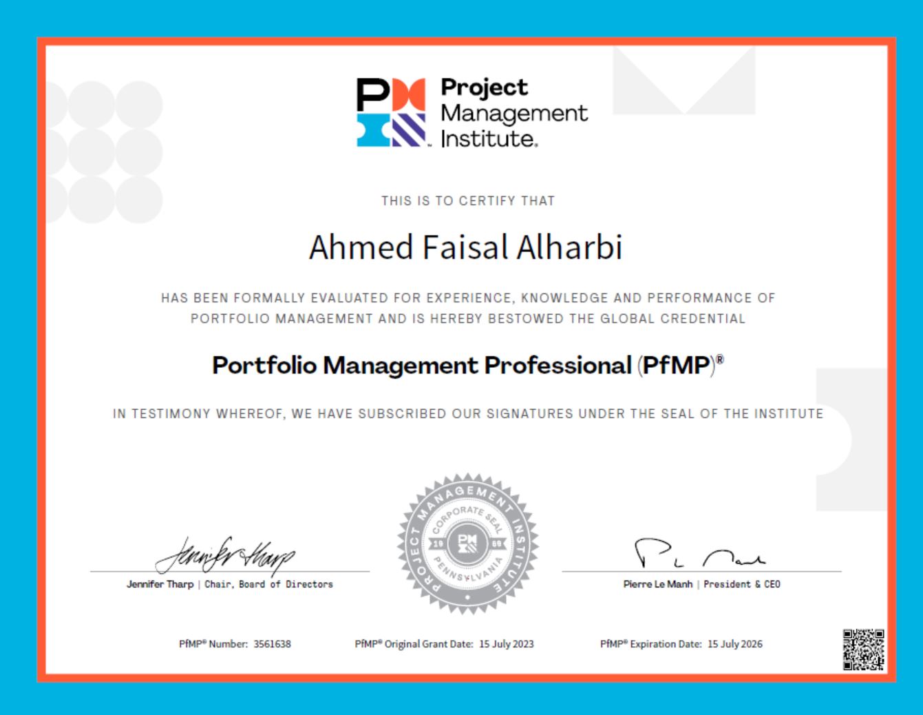 Congratulations Mr. Ahmed Alharbi on Achieving PfMP With Outstanding Score