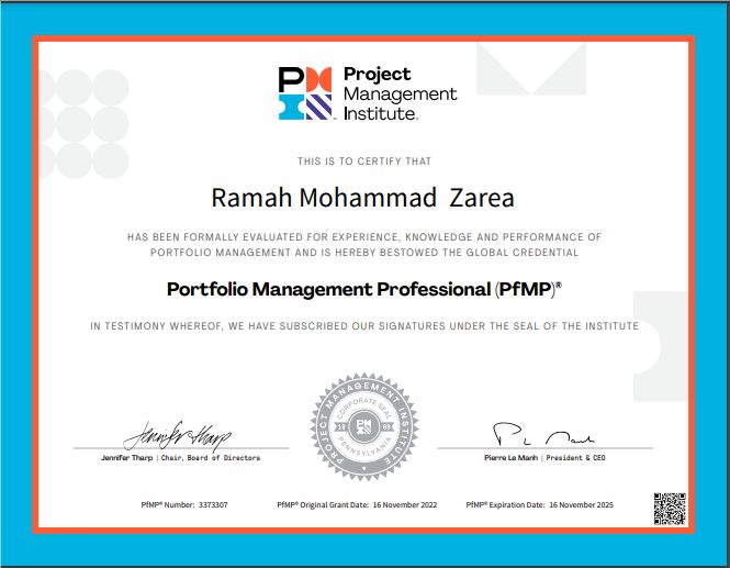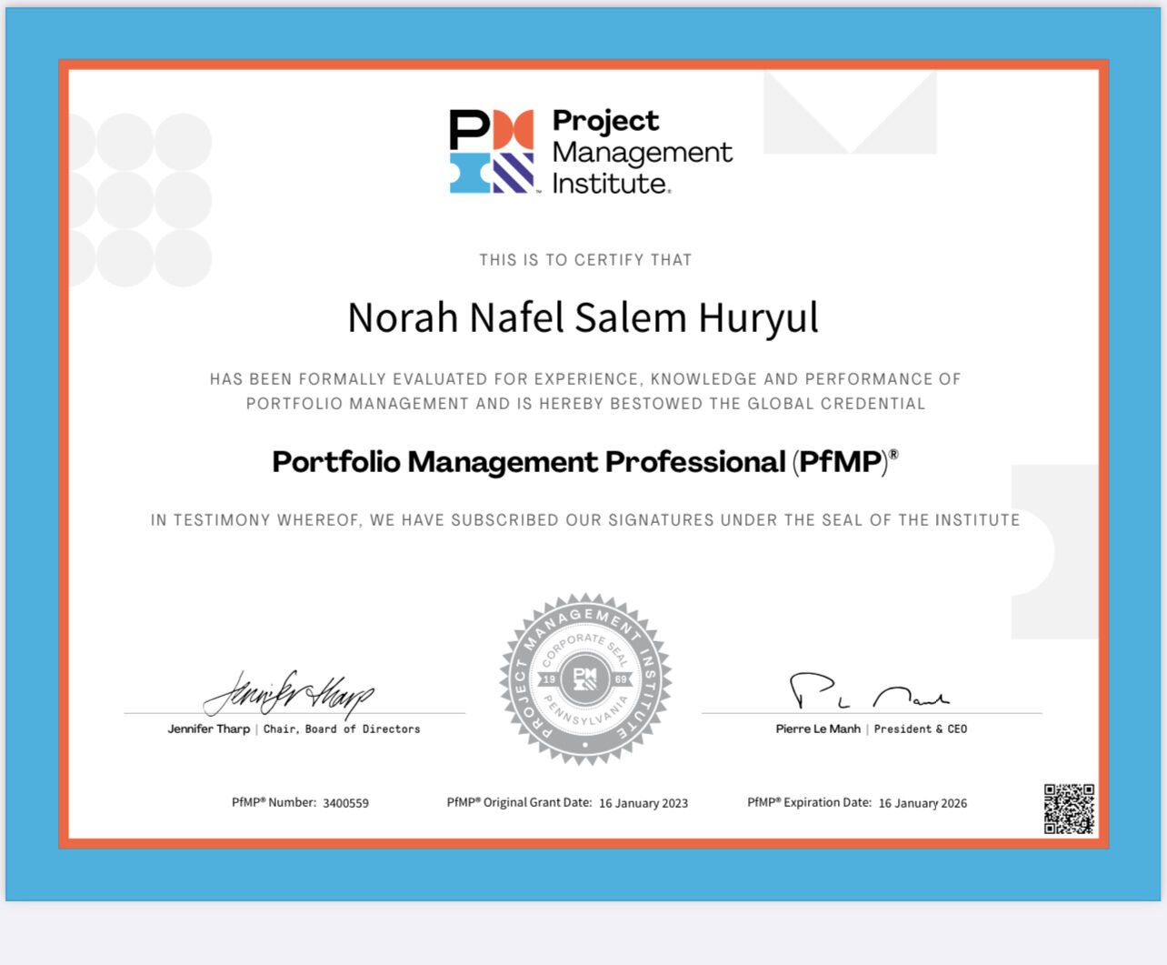 Congratulations Ms. Nourah Nafel Huryul on Achieving PfMP With Outstanding Score.